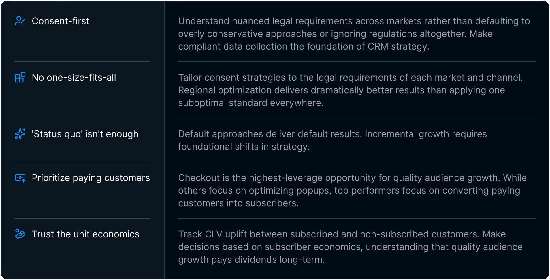 Most brands overlook this lever because they fail to understand the leverage that gets created when a customer is providing you first-party data. Checkout becomes the make-or-break moment for both regulatory compliance and marketing permissions.