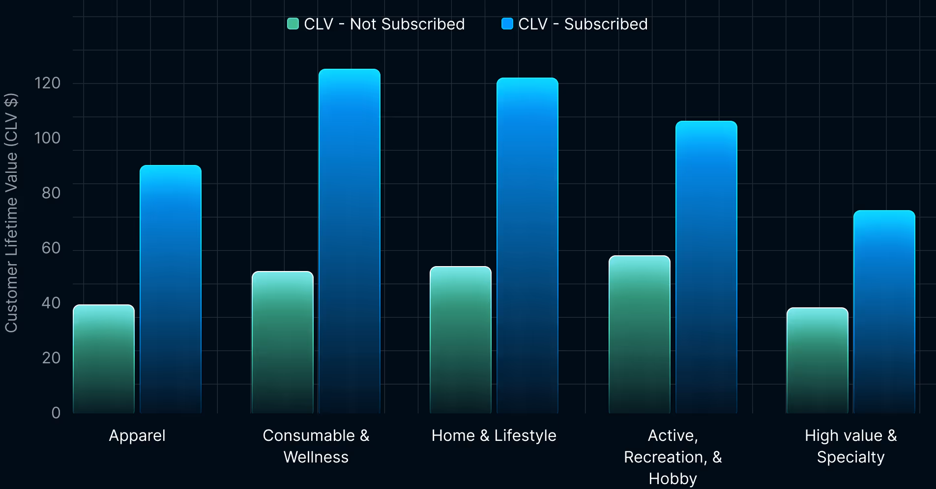 Consumable & Wellness brands have extremely high repeat purchase potential, driving the highest CLV lift across all verticals - nearly 3X from non-subscribed to subscribed customers. When consumers try a new product, they're evaluating whether it earns a spot in their regular rotation, often becoming part of weekly or monthly routines for years.